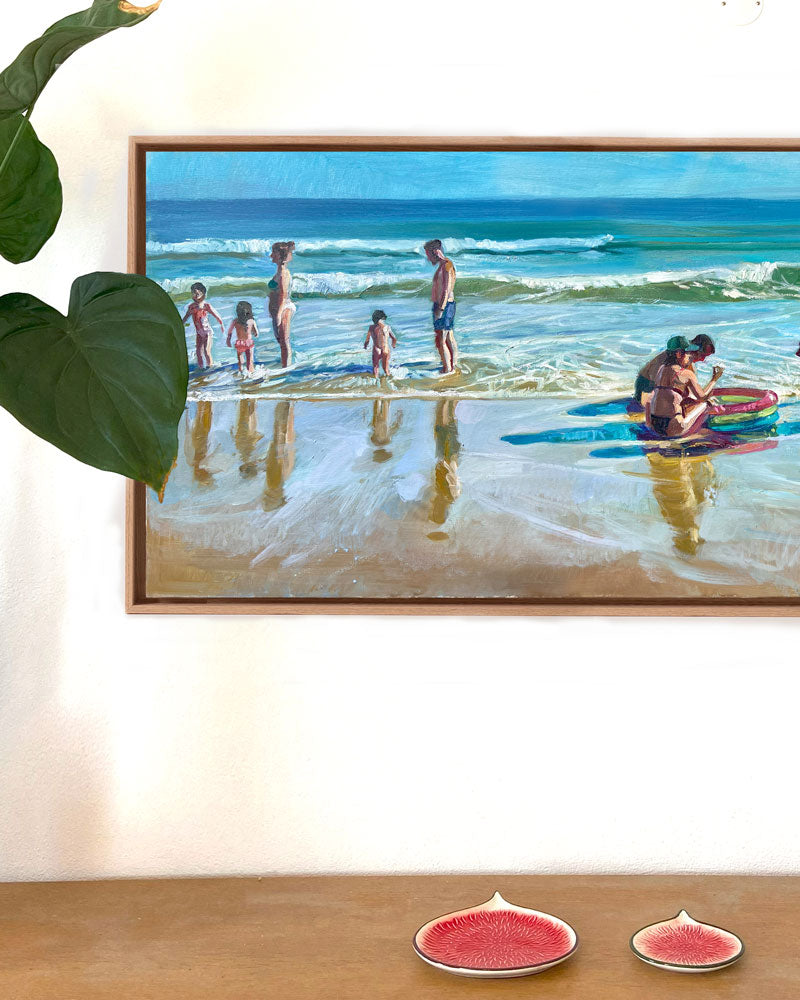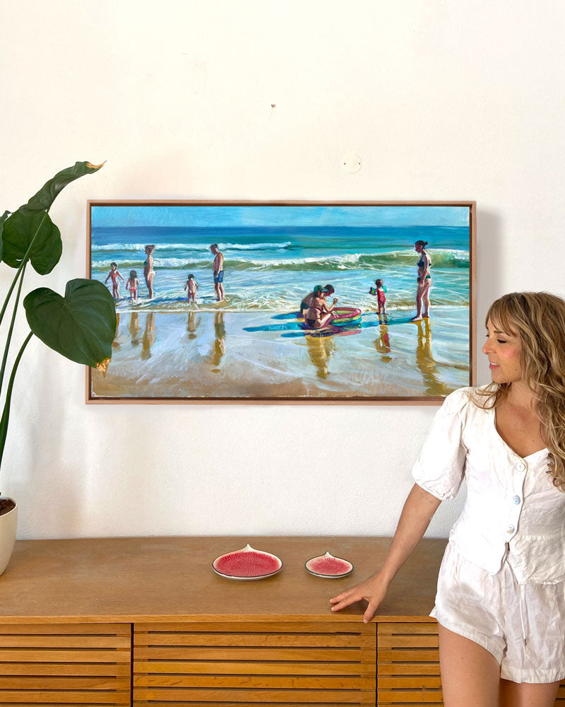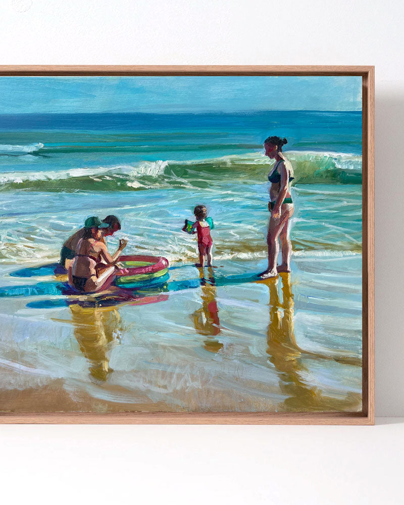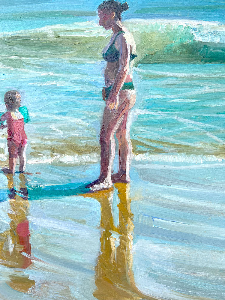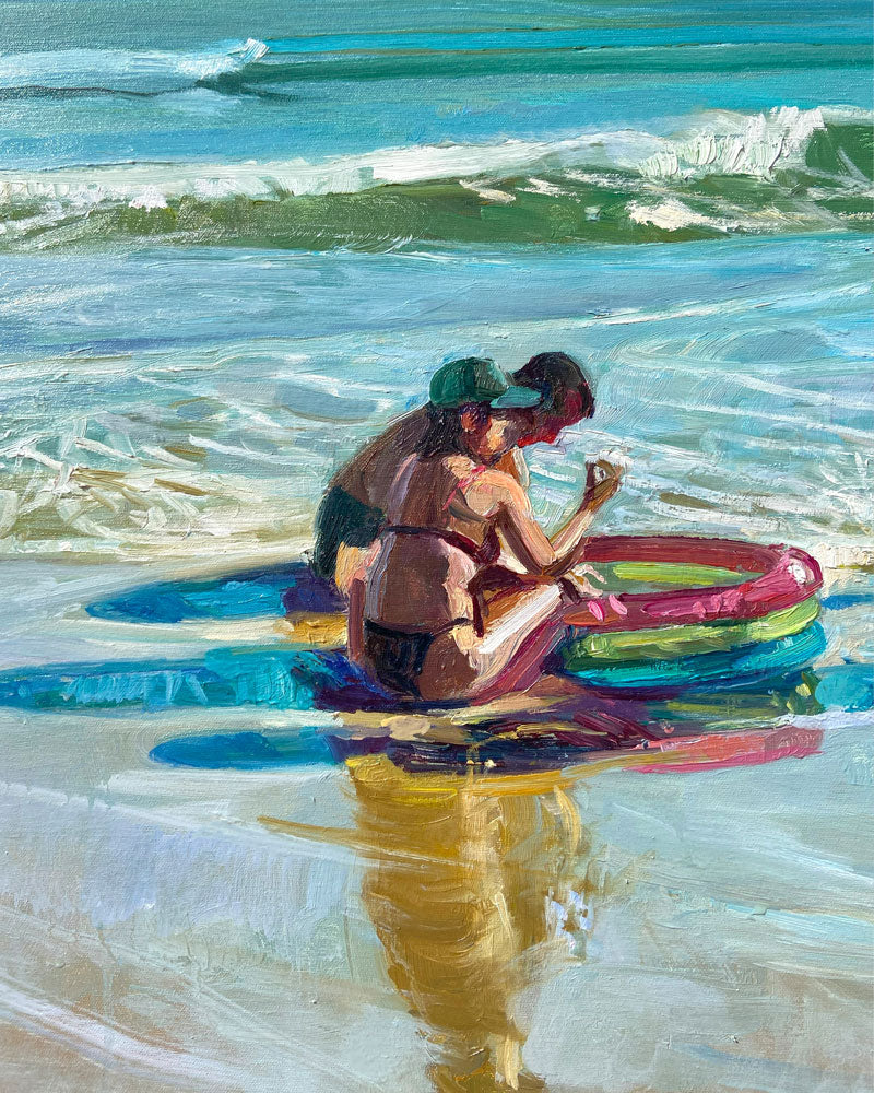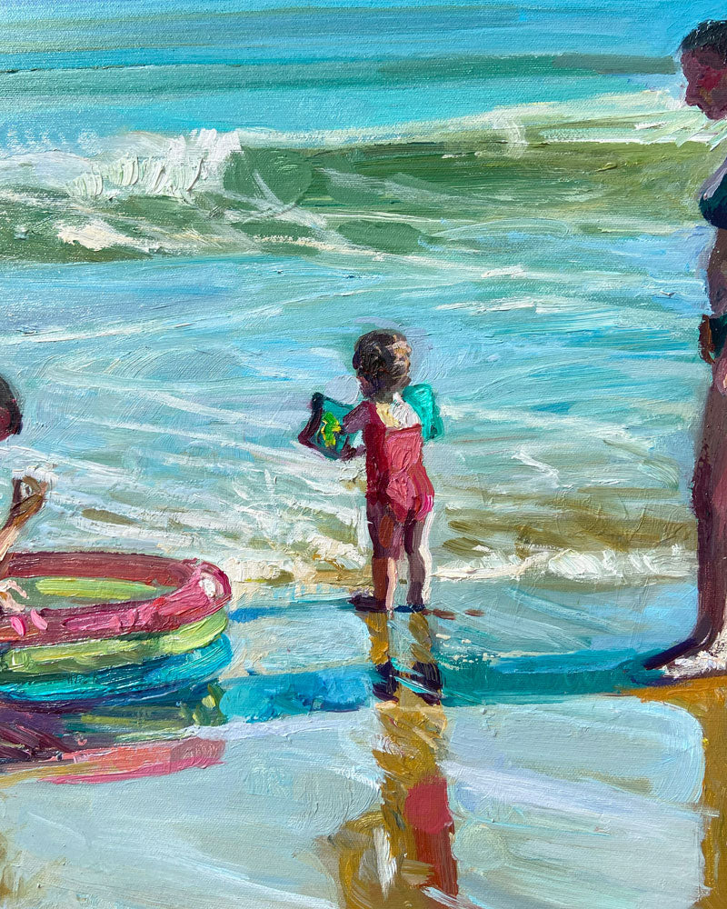 Es inspirador cómo intervenimos en el paisaje. Los bañadores y juguetes de playa se reflejan en la arena mojada, creando infinitos destellos de color y vida. Esta intervención no es invasiva, es poética. La alegría y el color de la experiencia humana pueden sumar capas estéticas a la perfección natural.