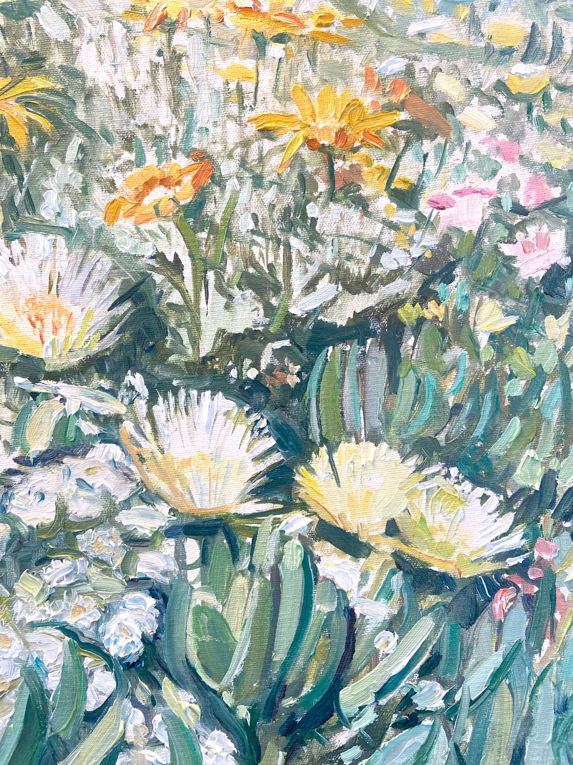 Un tapiz vibrante, lleno de margaritas naranjas y las flores de uña de gato, que cubren el campo como una tela. La pincelada, rica en color y textura, captura la exuberancia rítmica que me recuerda a los diseños de William Morris.