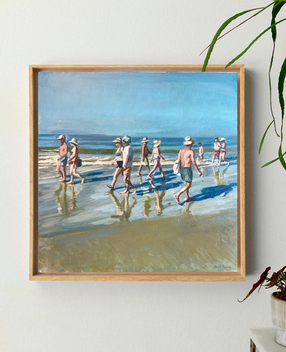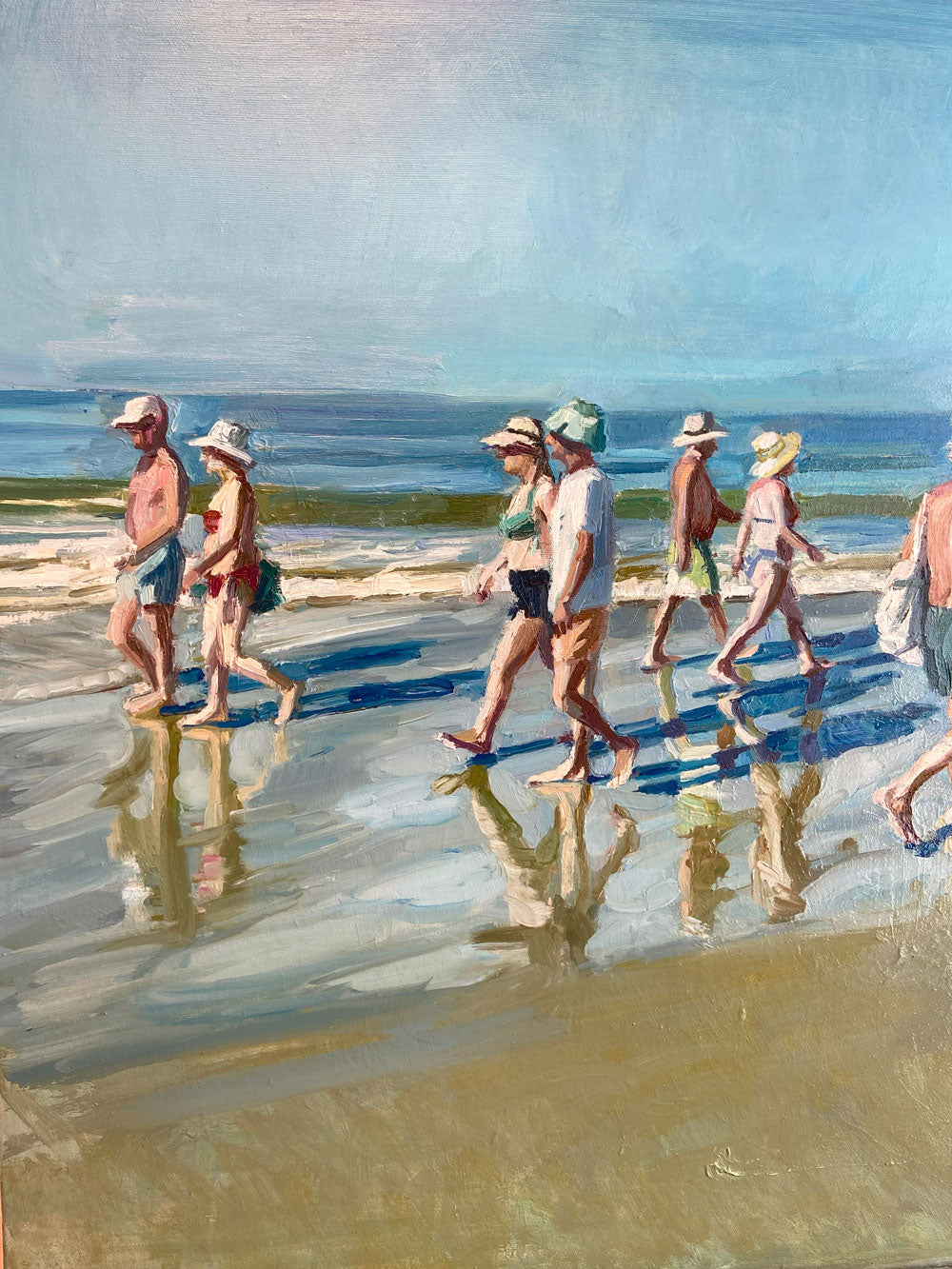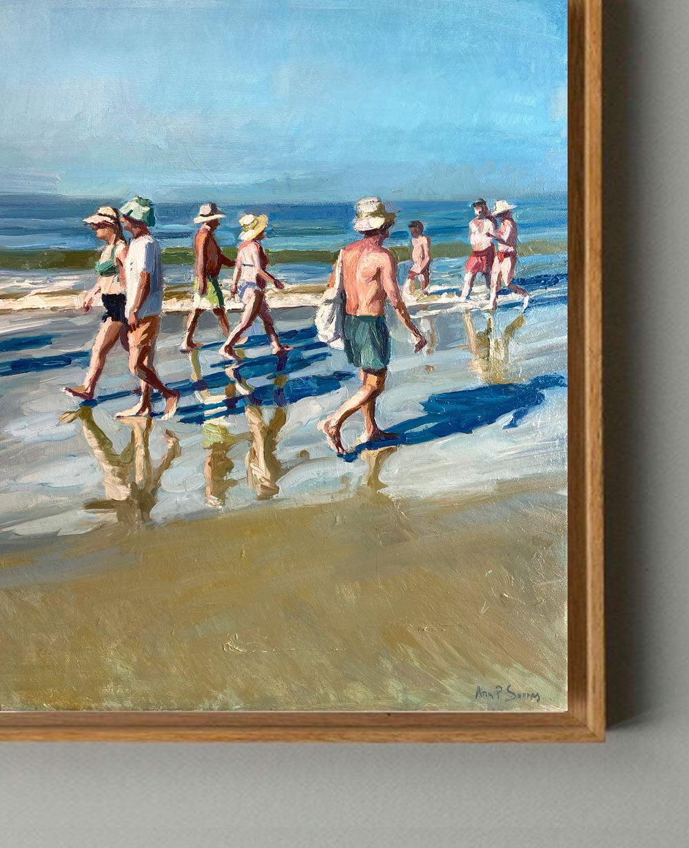 Un instante fugaz, donde las personas que pasean por el borde del mar reflejan sus pasos sobre la arena húmeda. Sus sombras, en azul profundo, se alargan y se mezclan con los reflejos sobre la arena, que vibran en mil colores.